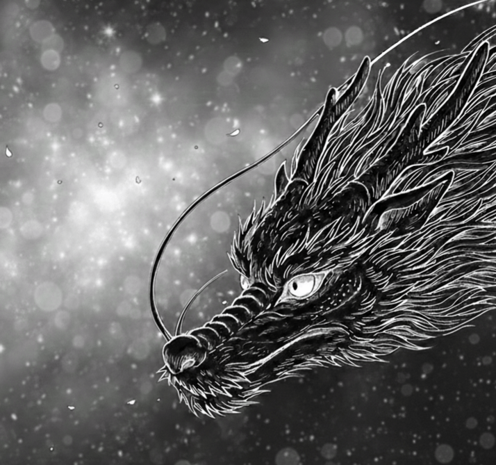 Un dragon noir et blanc. Écailles fines, lumineuses. Il pulse, ses moustaches frémissent,